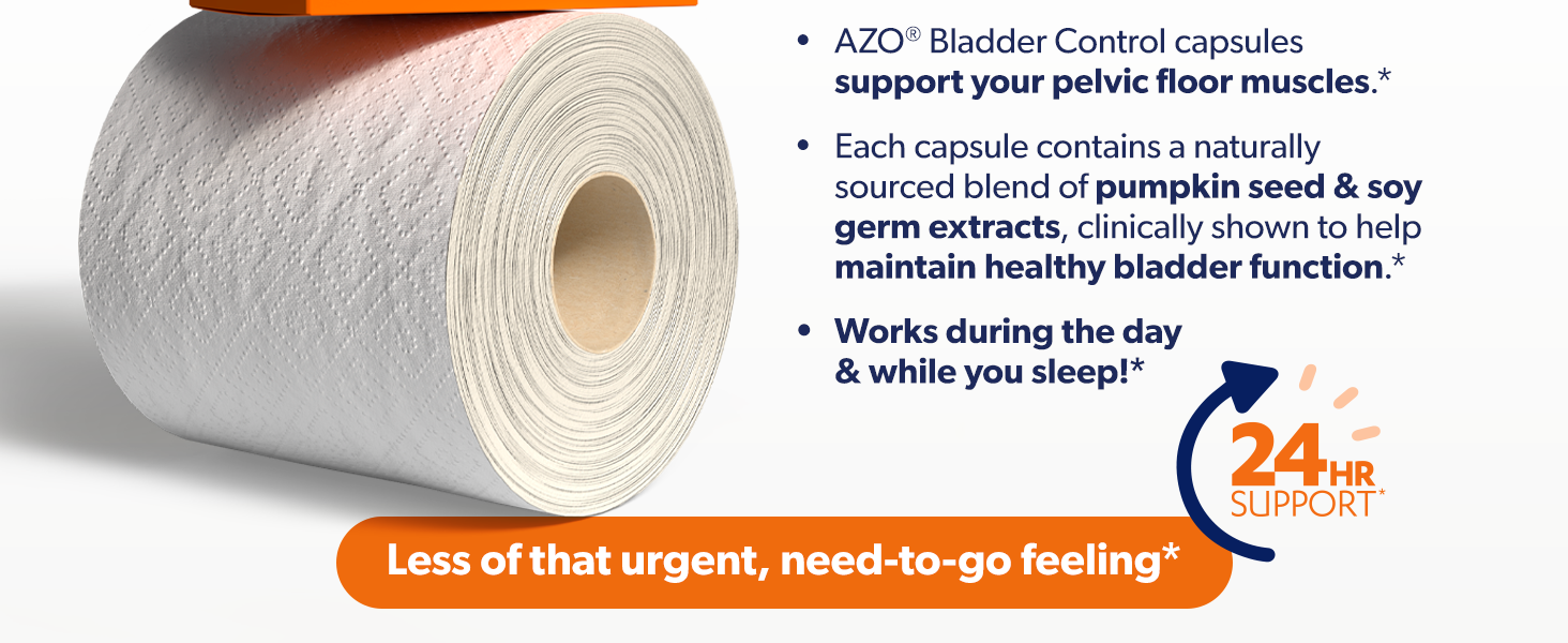 Less of that urgent need-to-go feeling! AZO® Bladder Control capsules support your pelvic floor muscles.*