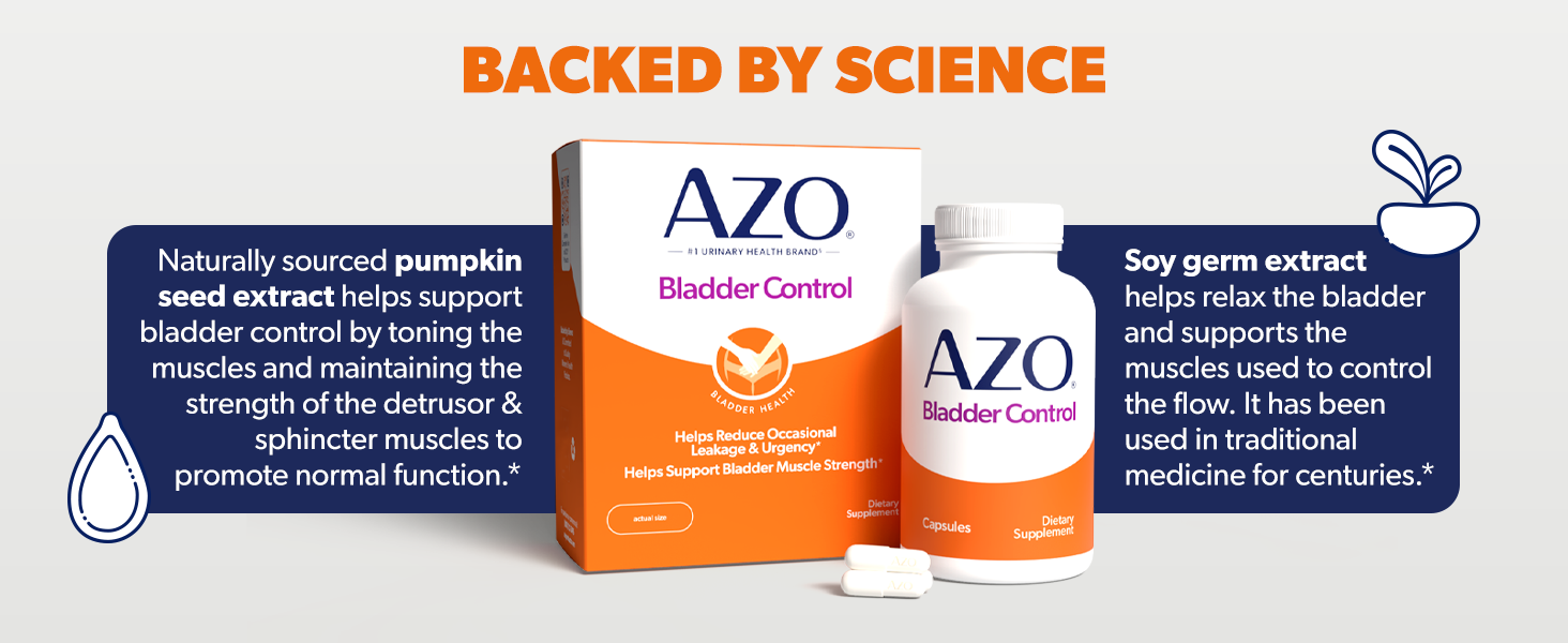 Wouldn't it be nice to sneeze, laugh and workout without worrying about those occasional pesky leaks? Each capsule of AZO® Bladder Control with Go-Less® contains a naturally sourced blend of pumpkin seed and soy germ extracts which are clinically shown to help maintain healthy bladder function.*