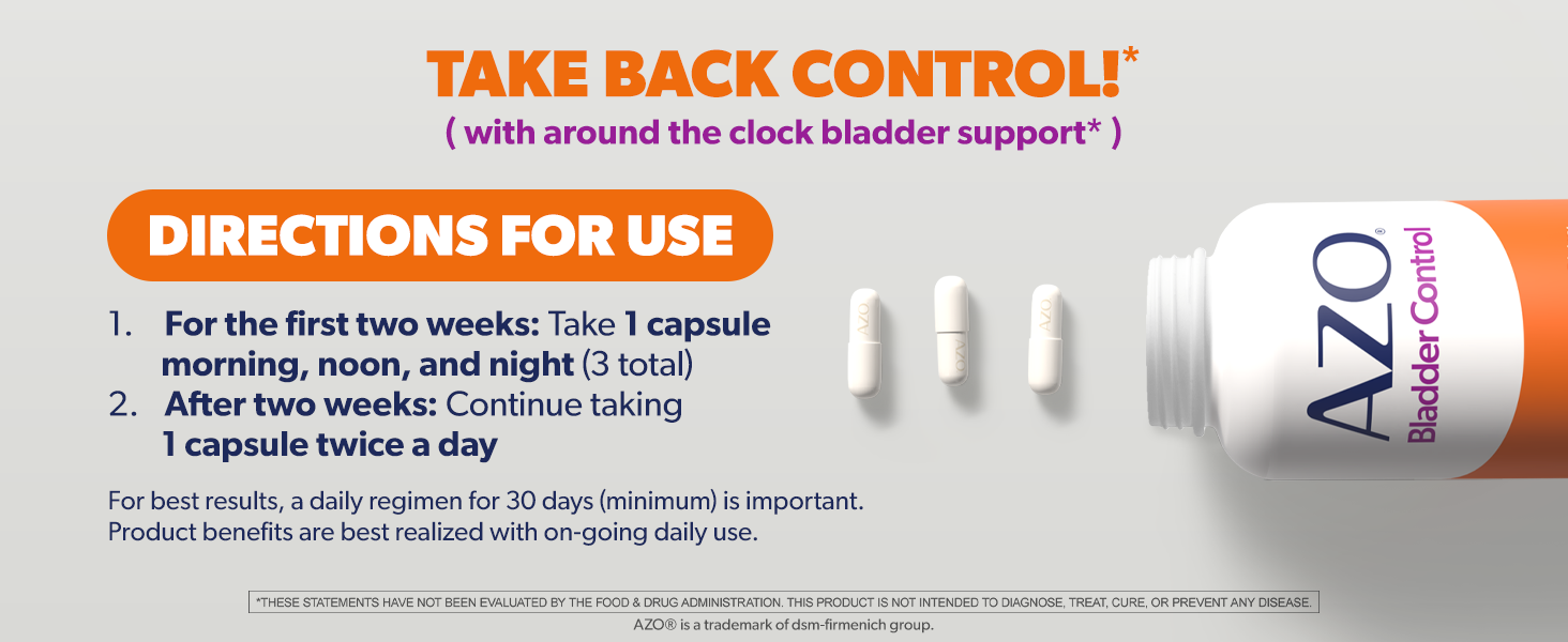 As with any dietary supplement, please inform your healthcare professional before taking. AZO® Bladder Control should not be used by pregnant or nursing women, or by children. If you are taking medication or planning a surgery, consult your doctor before using this product.