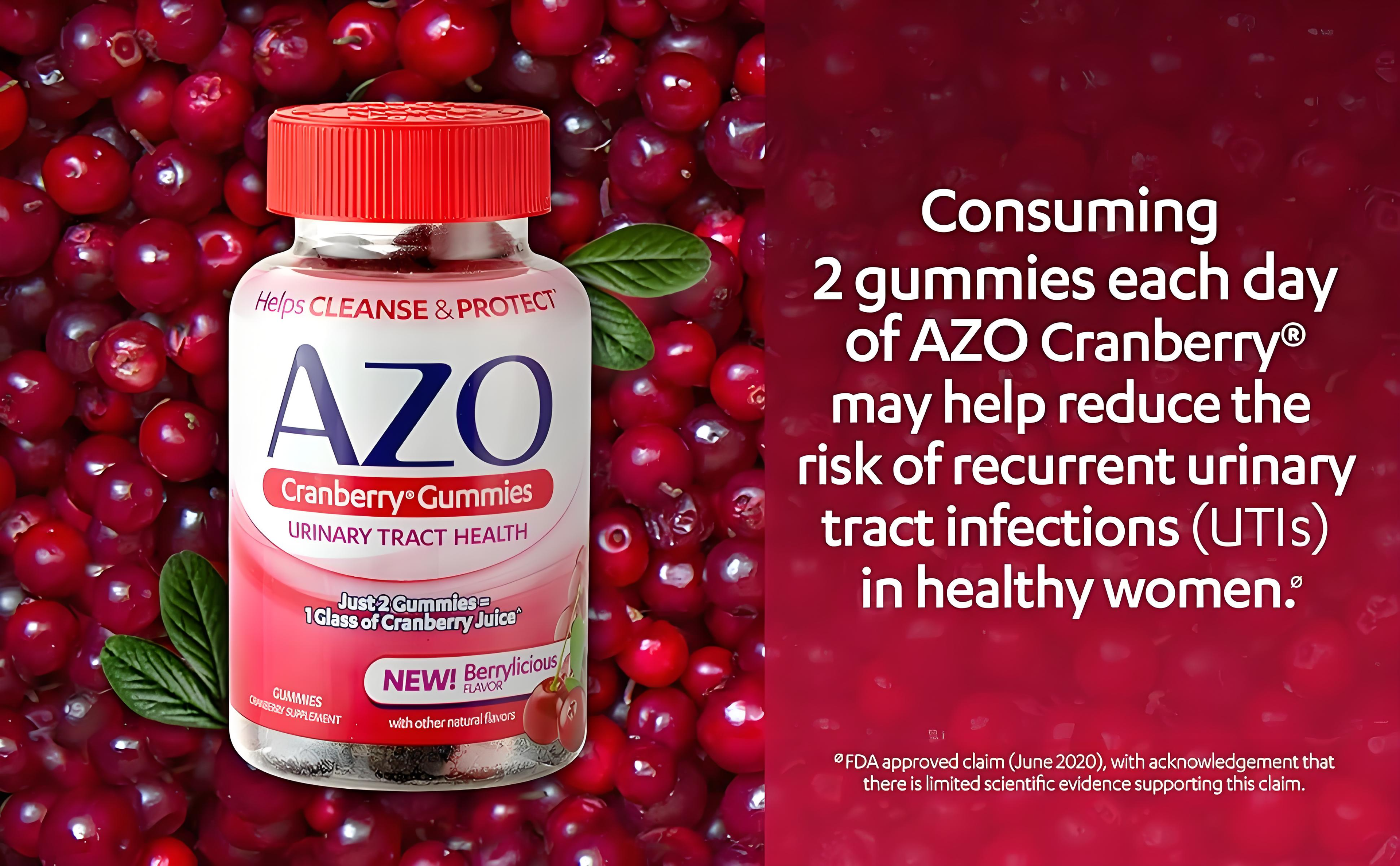 øConsuming two (2) gummies each day of AZO® Cranberry may help reduce the risk of recurrent urinary tract infection (UTI) in healthy women. FDA has concluded that there is limited scientific evidence supporting this claim.
